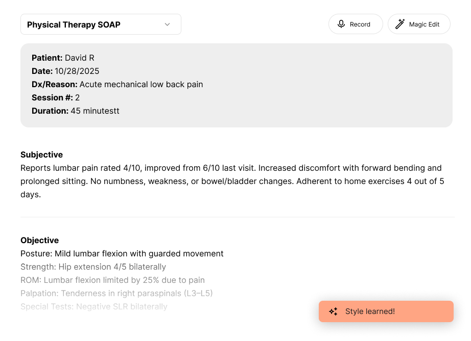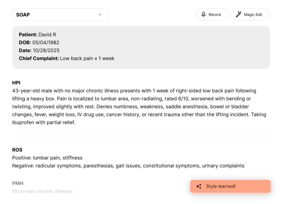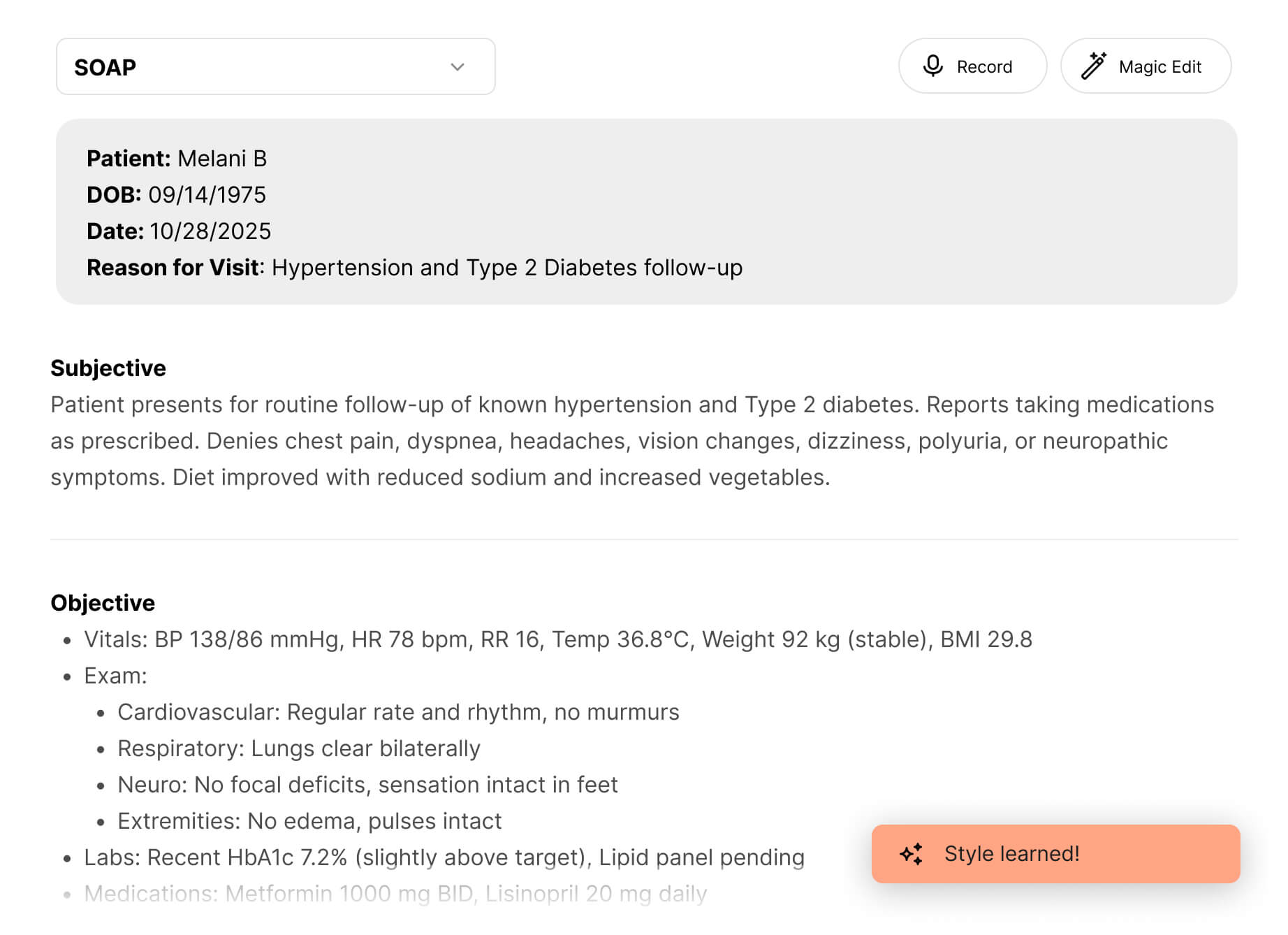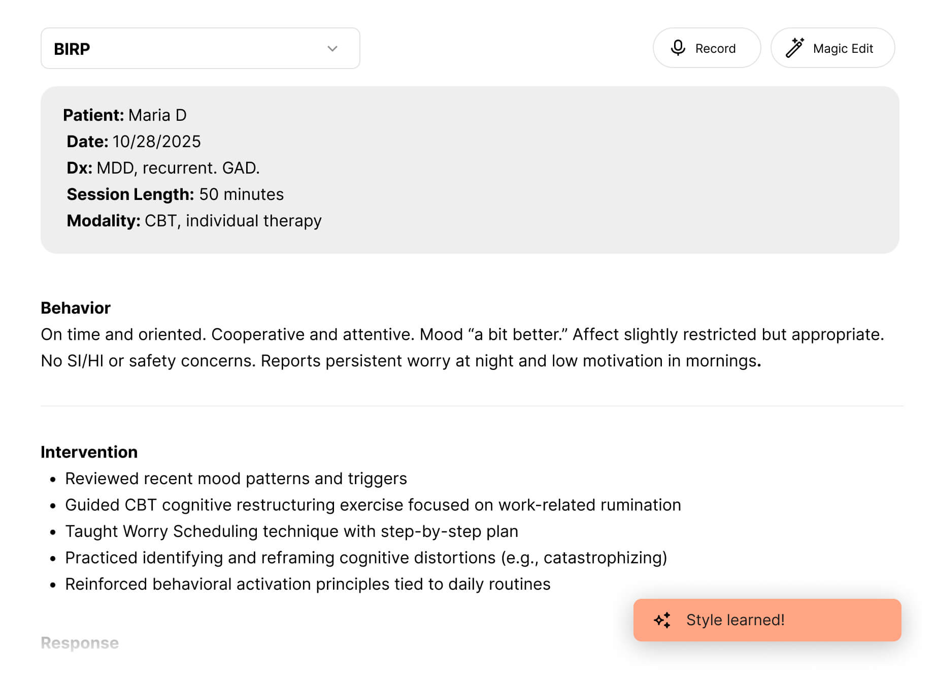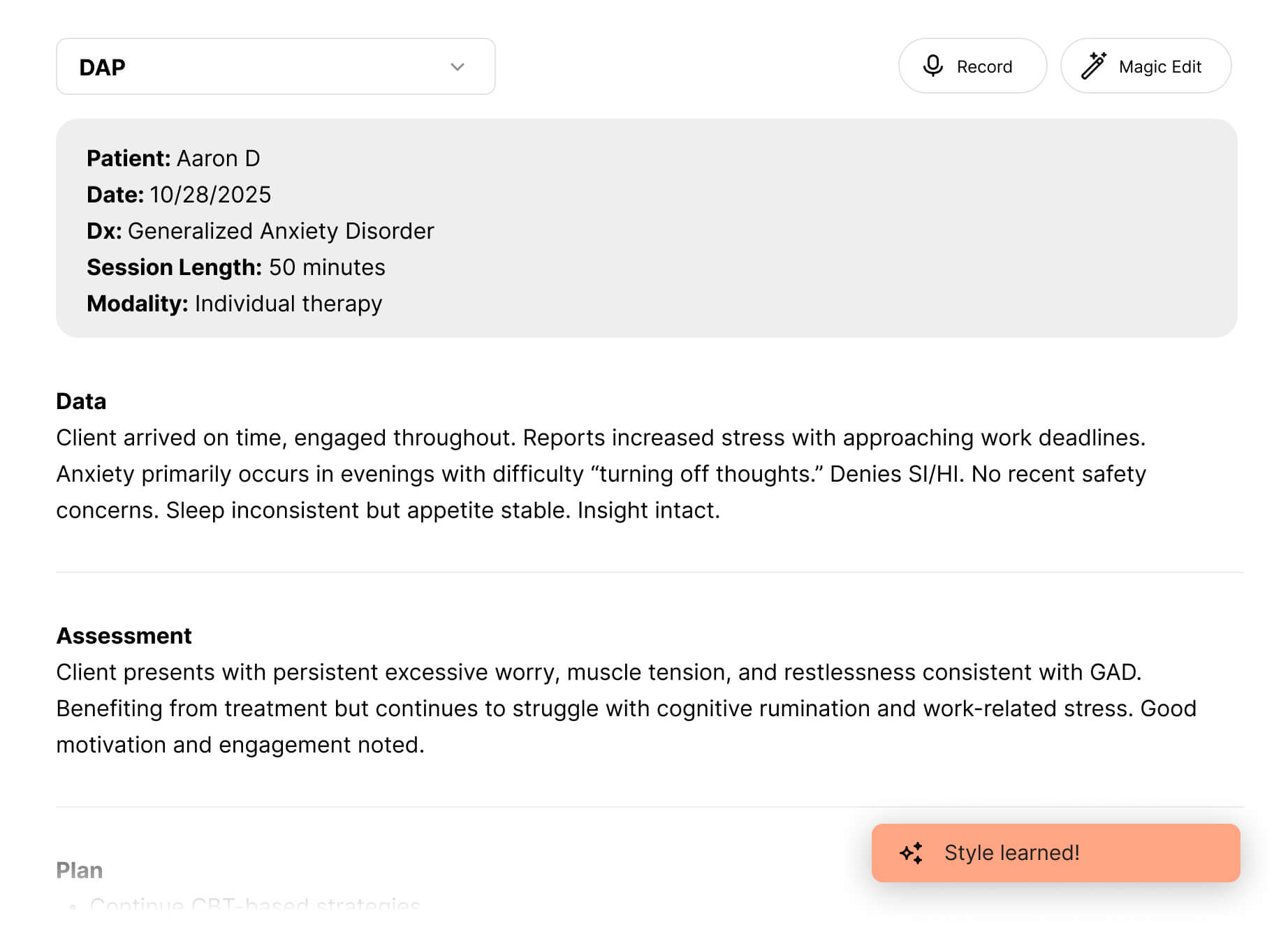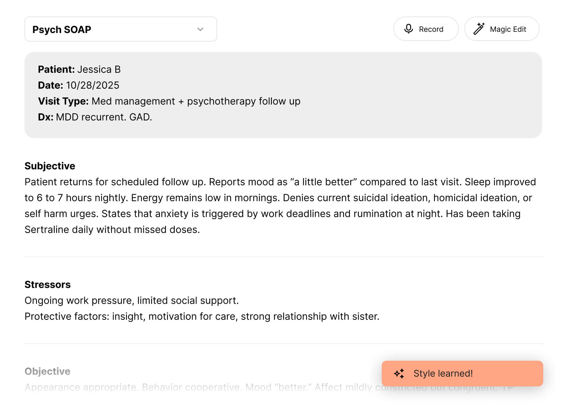 Yes. Twofold adapts to your clinical style and note preferences. The more you use it, the better it reflects your tone, structure, and documentation habits.