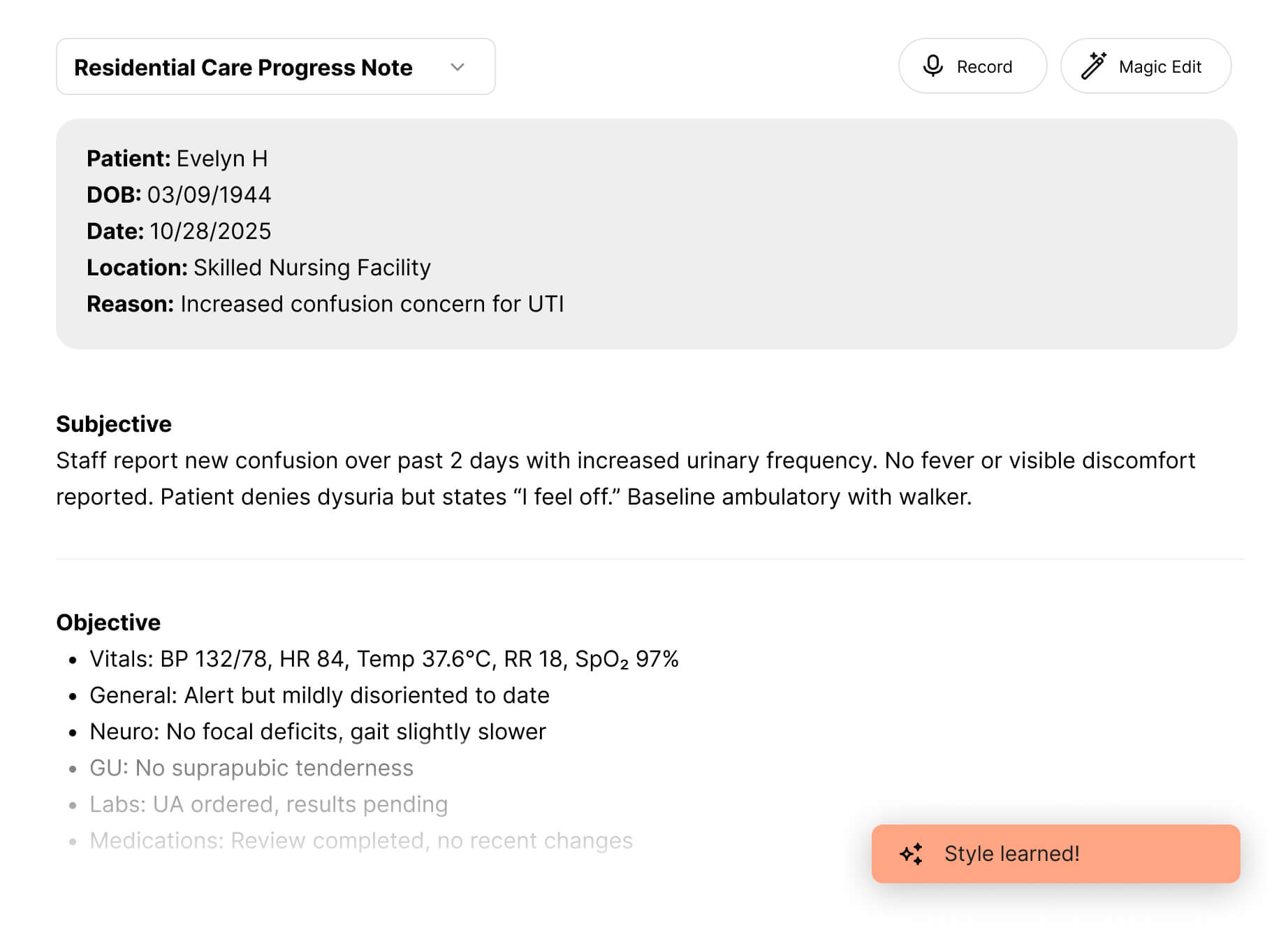 Yes. You can customize note structure, tone, wording, formatting, and templates. Many clinicians set up notes to match their EHR format exactly.
